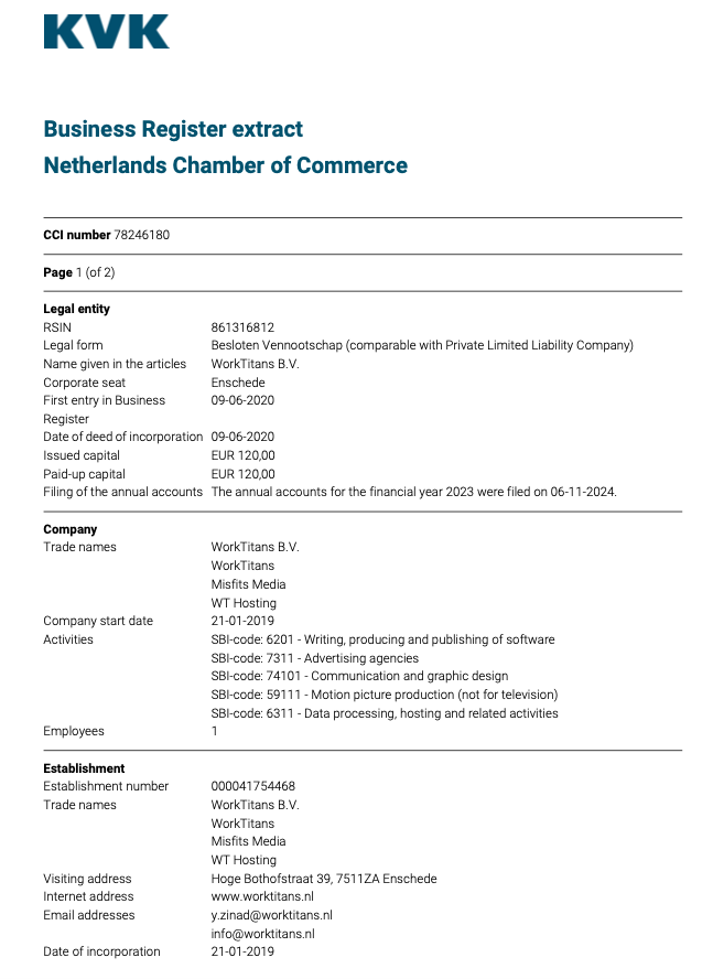 An incorporation document for WorkTitans B.V. from the Netherlands Chamber of Commerce.