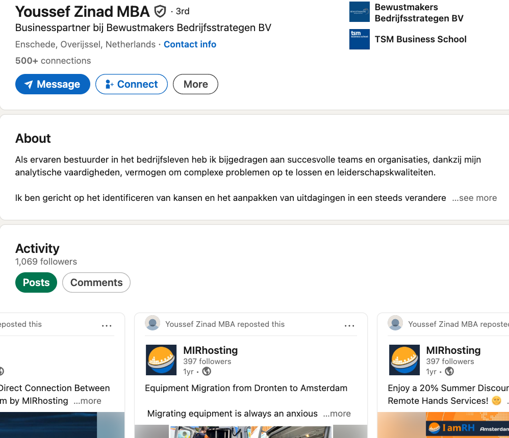 The incorporation document says the company was formed in 2019 by a y.zinad@worktitans.nl. That email address corresponds to a LinkedIn account for a Youssef Zinad, who says their personal websites are worktitans[.]nl and custom-solution[.]nl. The profile also links to a website (etripleasims dot nl) that LinkedIn currently blocks as malicious. All of these websites are or were hosted at MIRhosting.