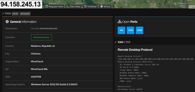 After the victim completes the fake verification process, a batch file containing NetSupport Manager Client files is downloaded from hxxps://2beinflow[.]com/head.php to the victim’s system (C:\ProgramData\jh.bat), where it is executed. The batch file retrieves a ZIP archive, saves it as C:\ProgramData\loy.zip, and then writes the extracted files into C:\ProgramData\Disy. The batch file then launches the NetSupport Manager Client application (client32.exe) and establishes persistence by creating a registry Run key. Although NetSupport Manager is a legitimate remote access tool, it is often referred to as NetSupport RAT due to its popularity with threat actors. CTU™ researchers observed the NetSupport RAT connecting to a command and control (C2) server at 94[.]158[.]245[.]13. As of this publication, this IP address is associated with a Windows Server 2012 operating system and exposes ports 3389 (RDP), 443 (HTTPS), and 5986 (WinRM) (see Figure 4).
