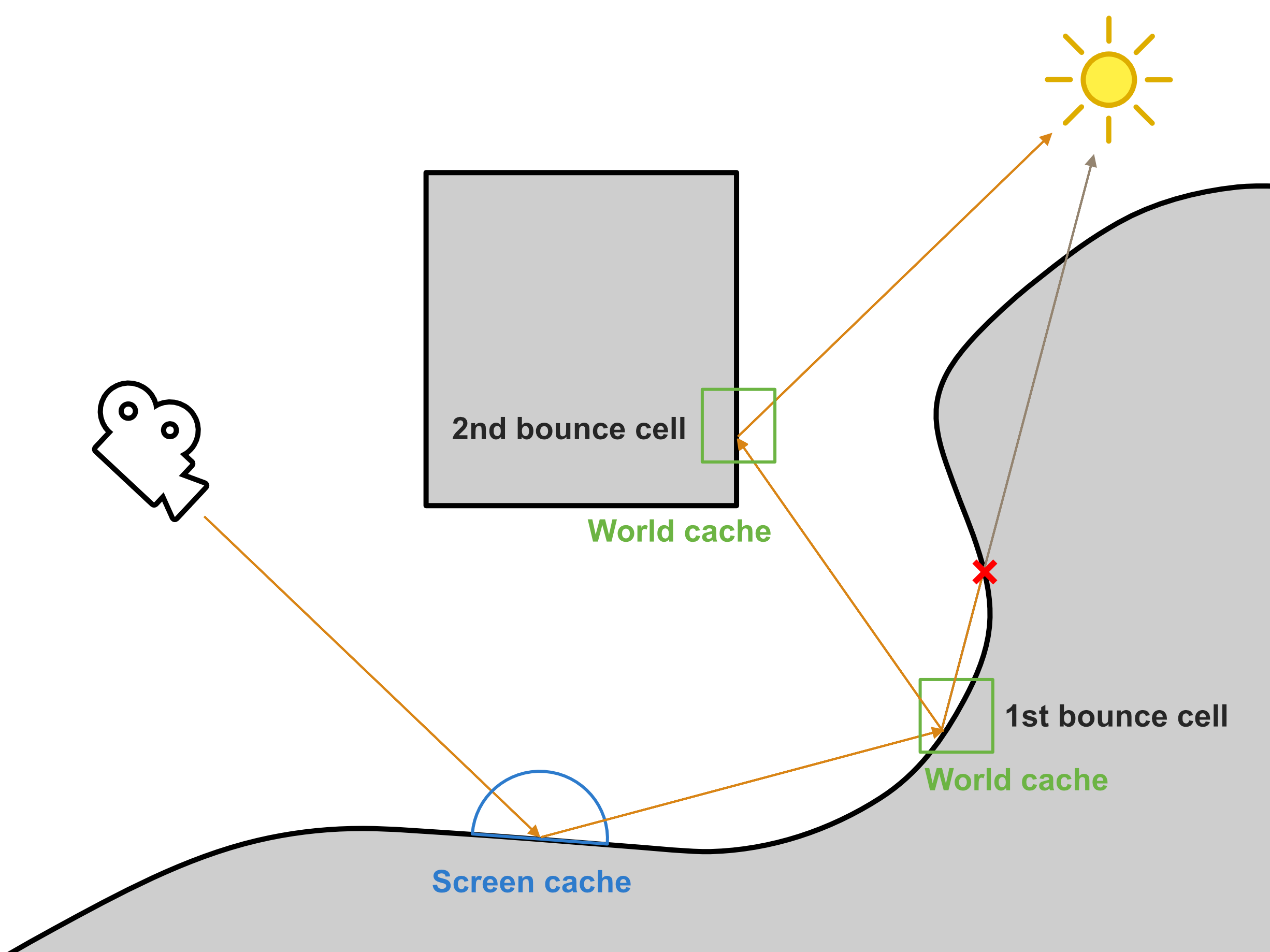 • The accumulated direct light from the 2nd bounce cells becomes an indirect sample for the 1st bounce cells.