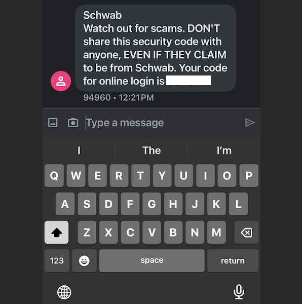 The 2FA text message from Schwab warns recipients against giving away their one-time code.